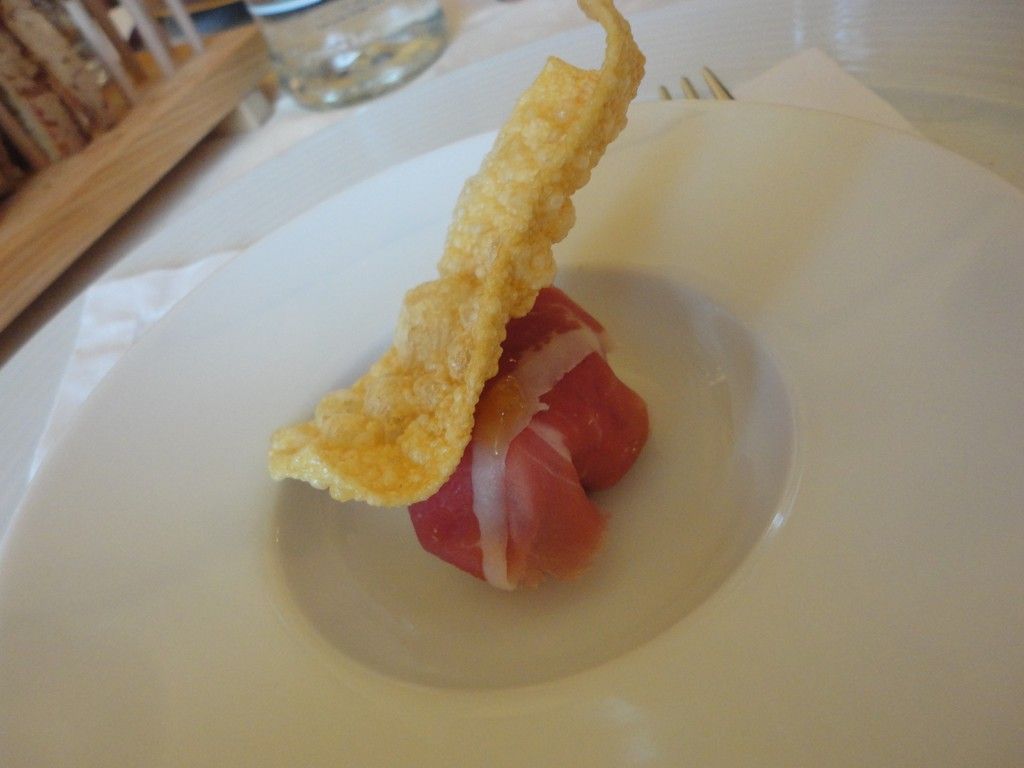 Il benvenuto consiste in una pallina di ricotta di podolica, avvolta in una fettina di prosciutto di maiale allevato allo stato semi-brado sulle colline del Formicoso e stagionato in grotta, con cialda di pasta croccante e miele d’acacia…In bocca tutta la rarefazione delle alture irpine, un retrogusto di selvatico e stranamente per un prodotto artigianale, nessun eccesso di sale. Lo accompagnamo con un’ottimo prosecchino.