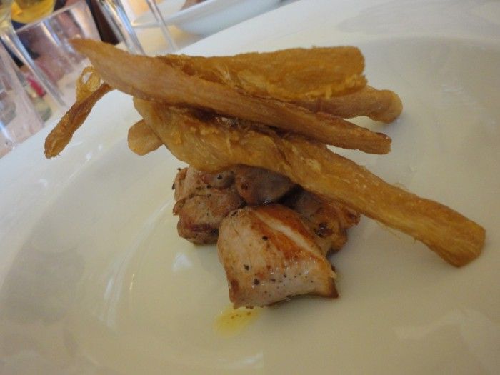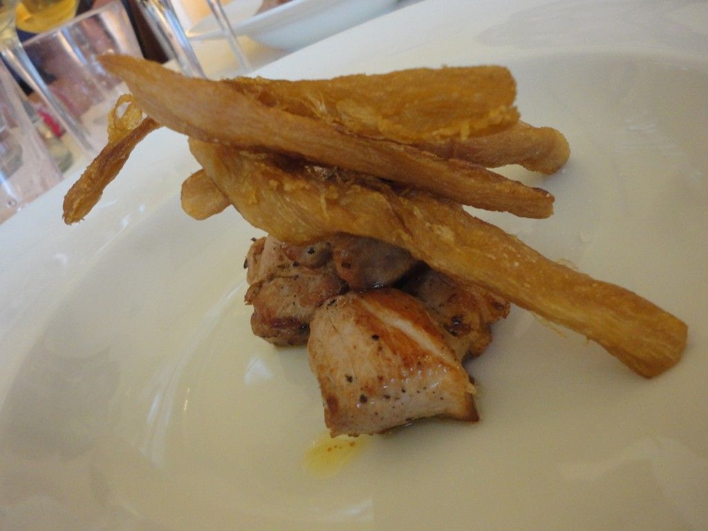 L’intenzione dello chef è quella di contribuire alla valorizzazione di un grande formato di pasta artigianale coniugandolo all’unica tradizione ittica possibile sulle colline dell’Irpinia, il baccalà. I pomodorini sono quelli della montagna a ridosso di S. Andrea, prodotti da una vecchietta di 70 anni senza trattamenti e senza irrigazioni. La pasta la conoscevamo già, una grande conferma. Per gli altri ingredienti un forte plauso a Pompeo, non solo per l’esecuzione, ma anche per la scelta del prodotto. Angela Frino, moglie di Pompeo, nonchè “angelo della sala”, per questo piatto ci ha cambiato vino. Furore Rosso 2005 Marisa Cuomo.