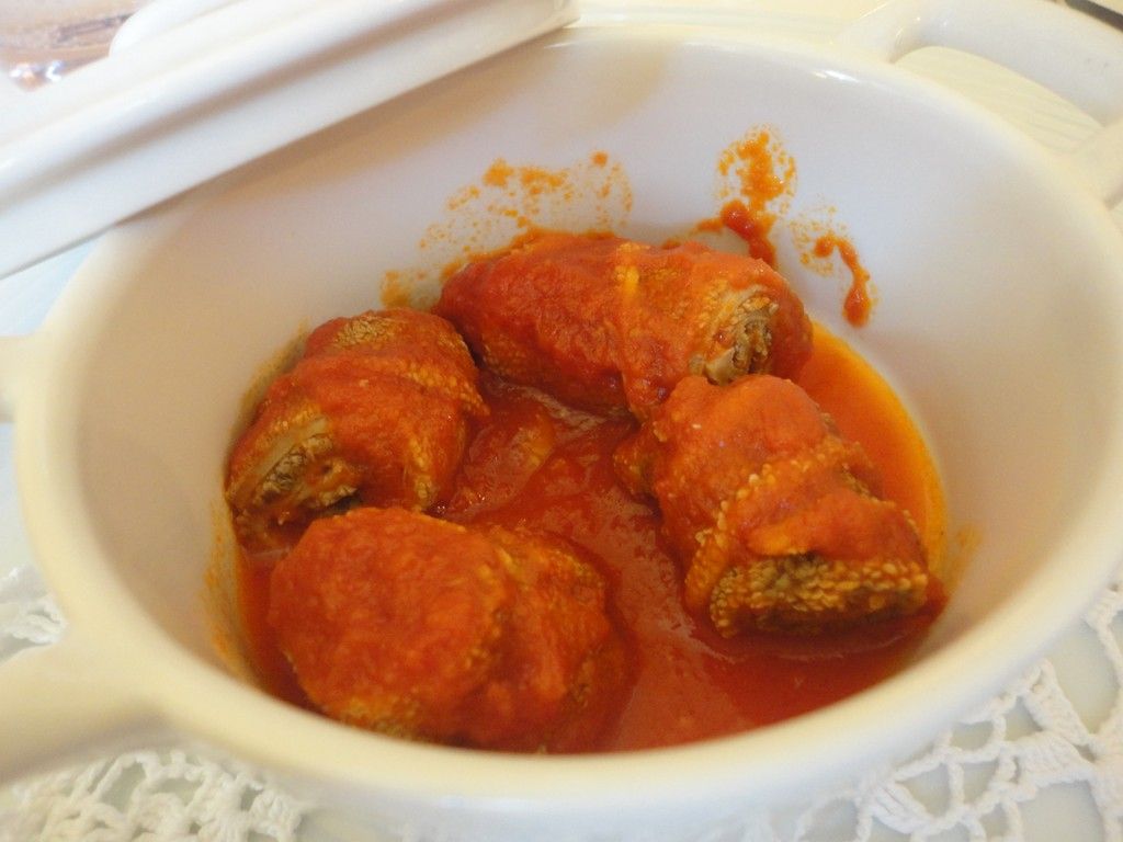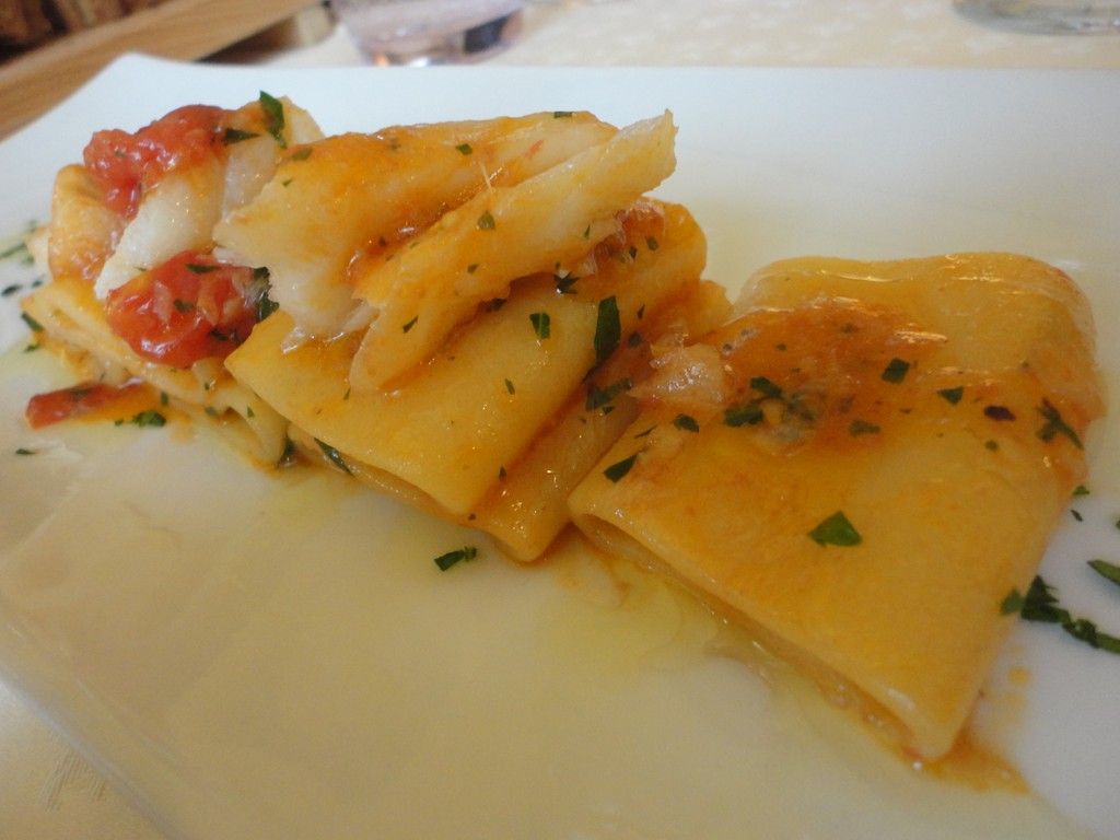 Pasta “fattizza” così si definisce in alta Irpinia la pasta fatta a mano. In questo caso incavata con tre dita (perciò Trieddo) dalle abili mani della suocera di Pompeo, Carmelina Savino…ad avercele di queste suocere ( poi in privato, magari potrei anche venire a fare uno stage da te, mi dirai come si fa a far lavorare moglie e suocera al posto proprio :-))!!! Ricetta, questa, riscoperta in un vecchio testo di cucina di una biblioteca di …Milano. Piatto di origini lucane e che nasce dall’esigenza di risparmiare il formaggio sostituendolo con delle mollichine di pane rosolate con poco olio insieme ai famosi peperoni dolci cruschi dell’Irpinia. La coniugazione perfetta dell’essenzialità con il gusto…E qui continuiamo con l’ esercitazione stilistica di Joaquin Raffaele Pagano, complice Maurizio De Simone ;-)). Ancora un altro primo: Paccheri del Pastificio dei Campi, baccalà e pomodorini.