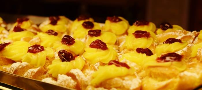 Arriviamo quindi in un giorno settimanale, di pomeriggio e senza aver annunciato la nostra visita. Ad accoglierci c’è proprio lui, Sabatino, ottantadue anni, di cui settanta di professione. Con un grande sorriso ci fa accomodare, mentre è intento a sistemare le sue creazioni nell’ampio banco dei dolci che troviamo di fronte l’ingresso. E così, senza neanche accorgercene, ci ritroviamo tra le mani una pasta “calda calda”.