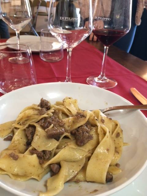 La bottiglia del Montefalco Sagrantino 2011 16% vol. DOCG è ornata con una moneta di Buzzetti che fa da etichetta e questa presentazione già la rende una bottiglia speciale; la sua lavorazione prevede una breve macerazione delle uve per poter sviluppare la parte più fruttata ed elegante che infatti caratterizza i vini che nascono a Montefalco; il suo naso profuma di muschio e humus, di ghiande e funghi ed è dotato di grandissima astringenza. Questo vino fa botte grande per due anni e l’annata 2010 mostra maggiore equilibrio nei profumi che ricordano la buccia d’arancia essiccata e in bocca rivela un’integrazione pazzesca tra tutte le componenti. Concludiamo gli assaggi dei vini dell’Az. di Filippo con la Vernaccia di Cannara Colli Martani DOC 2014 a base di Cornetta. In questo caso, spiega il produttore il nome deriverebbe da ” vernum” inverno in latino e non da ” vernaculum” come si attribuisce alla Vernaccia di Serrapetrona. Il suo sapore ricorda l’uva passa, le olive nere e le prugne e accompagnarla con la pasticceria secca è un ottimo modo per concludere il pasto.