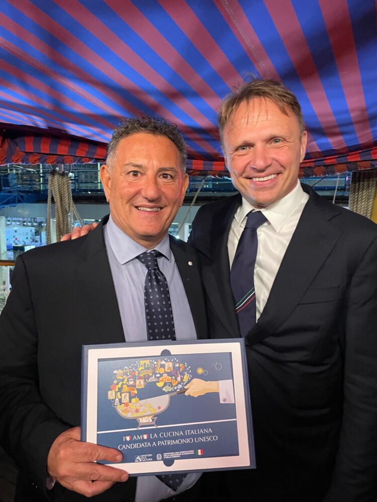 Un riconoscimento prestigioso per la nostra nazione, voluto dal Ministro dell’Agricoltura Francesco Lollobrigida. L’iniziativa si inserisce nell’ambito delle attività promosse dal Ministero della Cultura e dalla Farnesina per sostenere la candidatura della Cucina Italiana a Patrimonio Immateriale dell’Umanità UNESCO, un progetto che unisce tradizione, eccellenza e identità nazionale. Sal De Riso esporta le sue bontà in tutto il mondo, ed è un vanto per la Costiera amalfitana. Membro e presidente dell’Accademia Maestri Pasticceri Italiani (AMPI) ha ricevuto il premio a testimonianza del suo straordinario contributo all’arte dolciaria nazionale e del suo ruolo di ambasciatore del gusto italiano nel mondo. A bordo della nave scuola della Marina Militare Italiana, l’Amerigo Vespucci – definita non a caso “la nave più bella del mondo” erano presenti il Ministro Lollobrigida, il Sottosegretario Cirielli e gli chef stellati Nino De Crescenzo e Giuseppe Stanzione premiati per la loro attività.