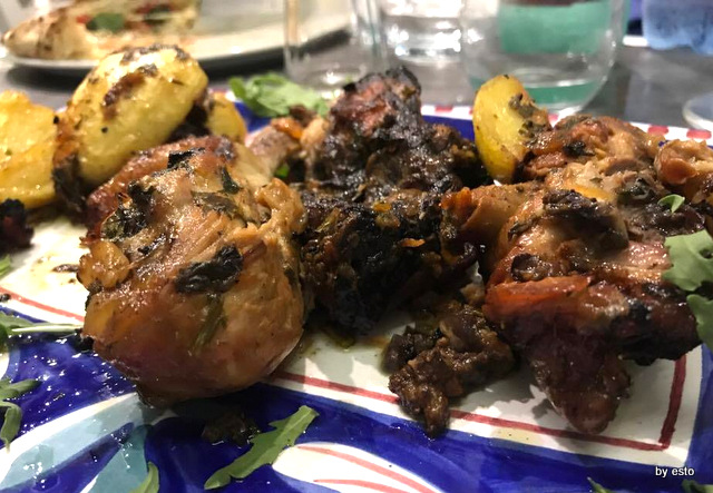 E da un pollo cotto nel ruoto al forno con le patate, qualche pomodorino e gli aromi.