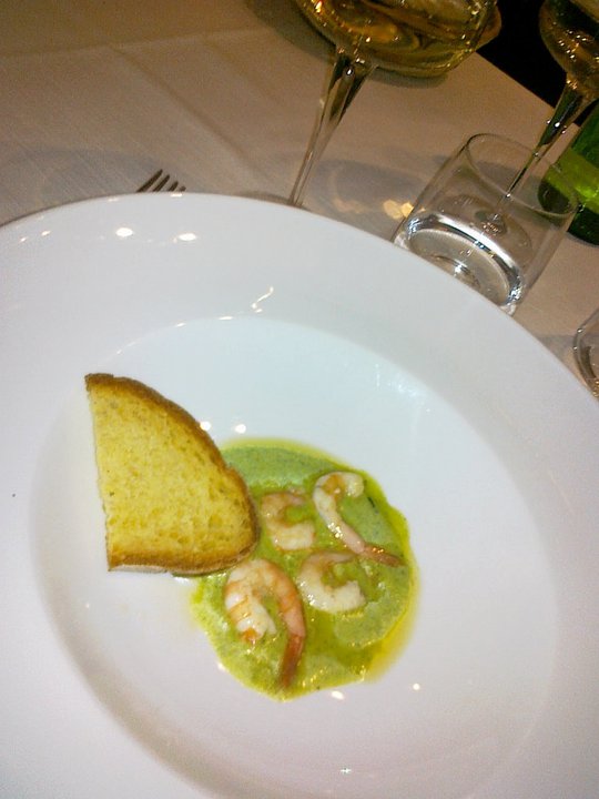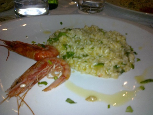 A pranzo abbiamo provato un tris di antipasti caldi, più che soddisfacente: gamberi appena scottati su crema di zucchine; una zuppetta di fagioli di Controne, vongole veraci e cannolicchi; e una parmigianina di triglie.