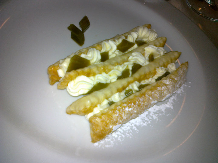 Poi la sorpresa esterofila: divertenti bon bon di pollo al curry con funghi porcini al timo e patata al formaggio; tutti gli ingredienti stanno in ottima compagnia, un piatto gustoso e goloso. Curiosità e vivacità applicate con metodo. Traspare la voglia di Marco di uscire, divertendosi senza esibizionismo, dai percorsi usuali: l’incontro con le spezie nasce grazie ad un aiuto non italiano.