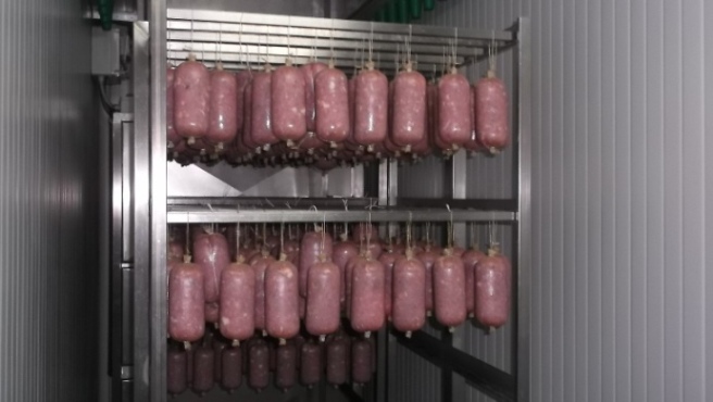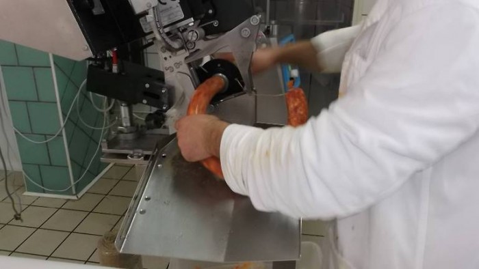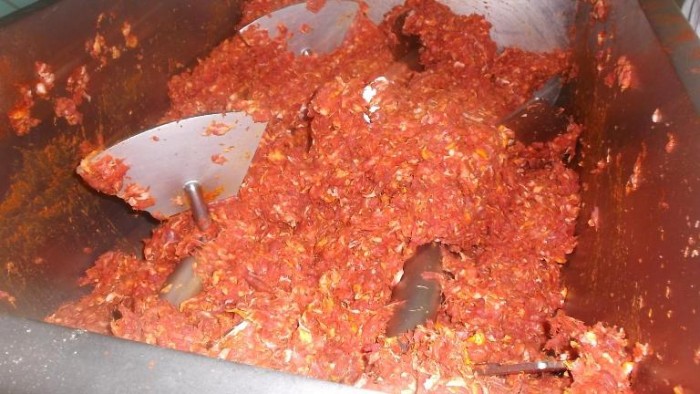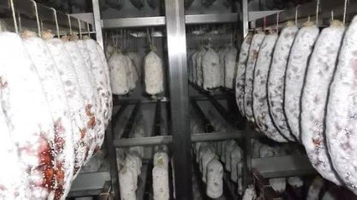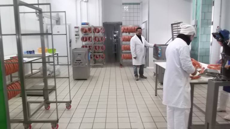 Il processo di lavorazione è molto rigoroso ed è affidato alla manualità di due dipendenti che usano le macchine unicamente per l’impasto e la tritatura della carne e la riempitura automatica del budello. Il periodo di essiccazione varia da un mese e mezzo a due mesi, mentre la successiva fase di stagionatura avviene in un ambiente asettico e perfettamente igienico (io stesso ho dovuto indossare camice bianco, mascherina e copriscarpe per poter accedere al reparto), ben areato e dotato di giusta umidità, per un periodo che va da un minimo di cinque-sei mesi fino ad un anno.