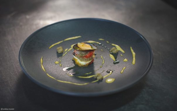 A Londra, però, Salvatore presenta un altro piatto, più complesso ed elegante pur nella sua essenzialità, e sceglie un altro tipo di pomodoro, i datterini semi-dry di Così com’é. Appena conditi da qualche goccia di aceto balsamico e qualche foglia di timo, vengono inseriti nella rivisitazione della classica parmigiana di melanzane – simbolo della rassicurante cucina di casa del Sud – a base di polpa di melanzana, gamberoni marinati, cozze ed erbe aromatiche. Accompagnato da un bicchiere di acqua di pomodoro e da una bruschetta che giocano tra acidità e dolcezza, è un boccone che alterna note salate, dolci e amare, riassumendo tutta l’essenza del Mediterraneo e scandagliando le infinite possibilità del prodotto da cui tutto è partito: il pomodoro, appunto.