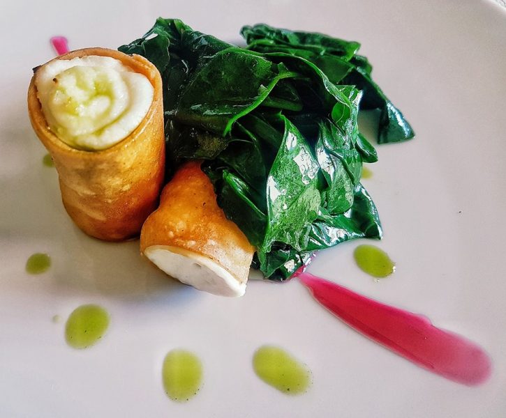 Il cannolo ripieno di ricotta e spinaci è una carezza, goloso e con la verdura vera protagonista del piatto. L’agnello cotto nel fieno resta un altro dei grandi cavalli di battaglia di Salvatore, la materia prima è di quelle vere, dove il cuoco deve stare attento a non rovinarne il sapore, rispettando il più possibile la carne, in due servizi anche con lo stufato, delizioso.