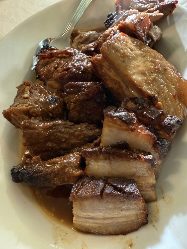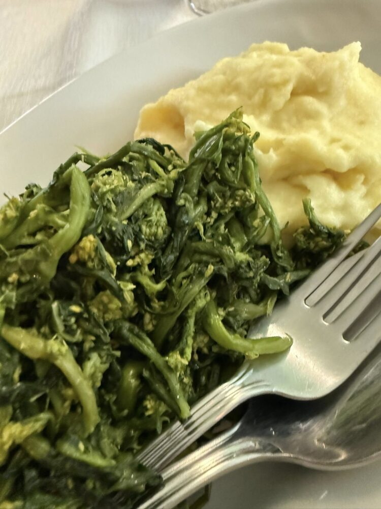 Ultimo cambio di calici per accompagnare la lombata e il maiale, con broccoli e purea di patate all’olio. Mentre la carne racconta il territorio, il figlio mette l’ultimo pezzo: Profumo di Vulcano di Federico Graziani. Fumo, sale, profondità. Un vino che chiude il cerchio e dona eleganza a un contesto diversamente rurale.