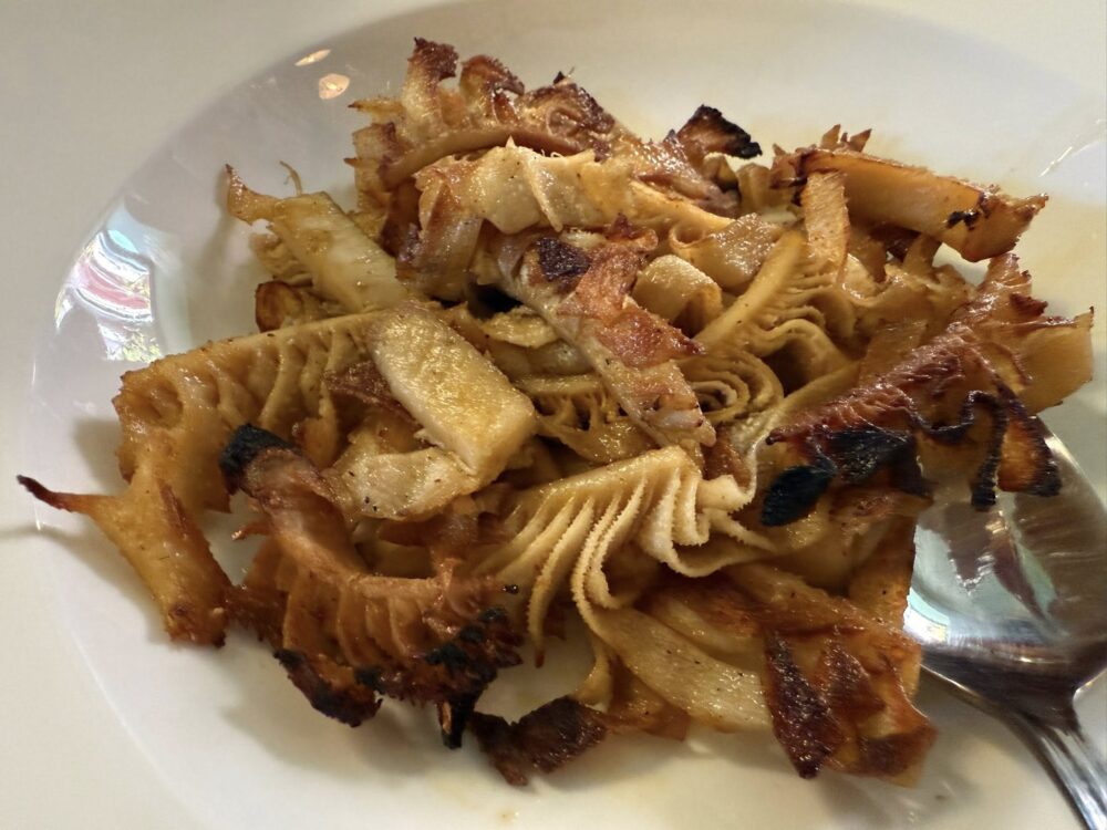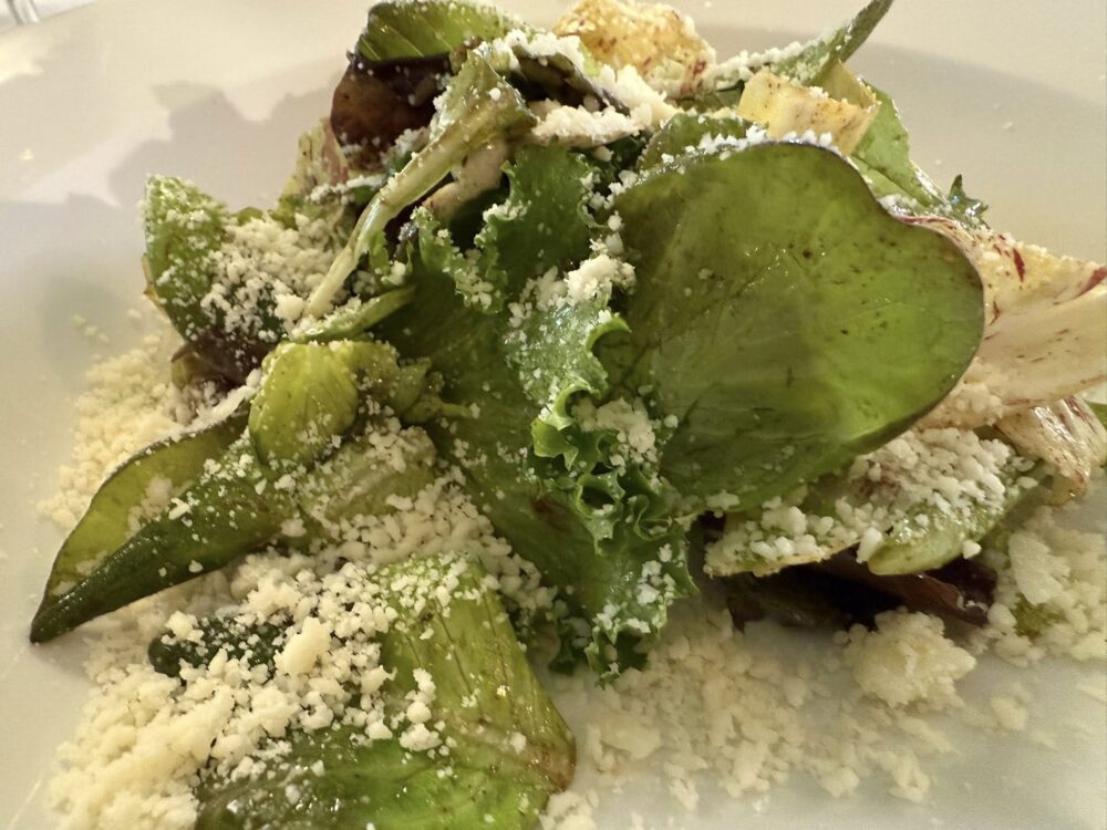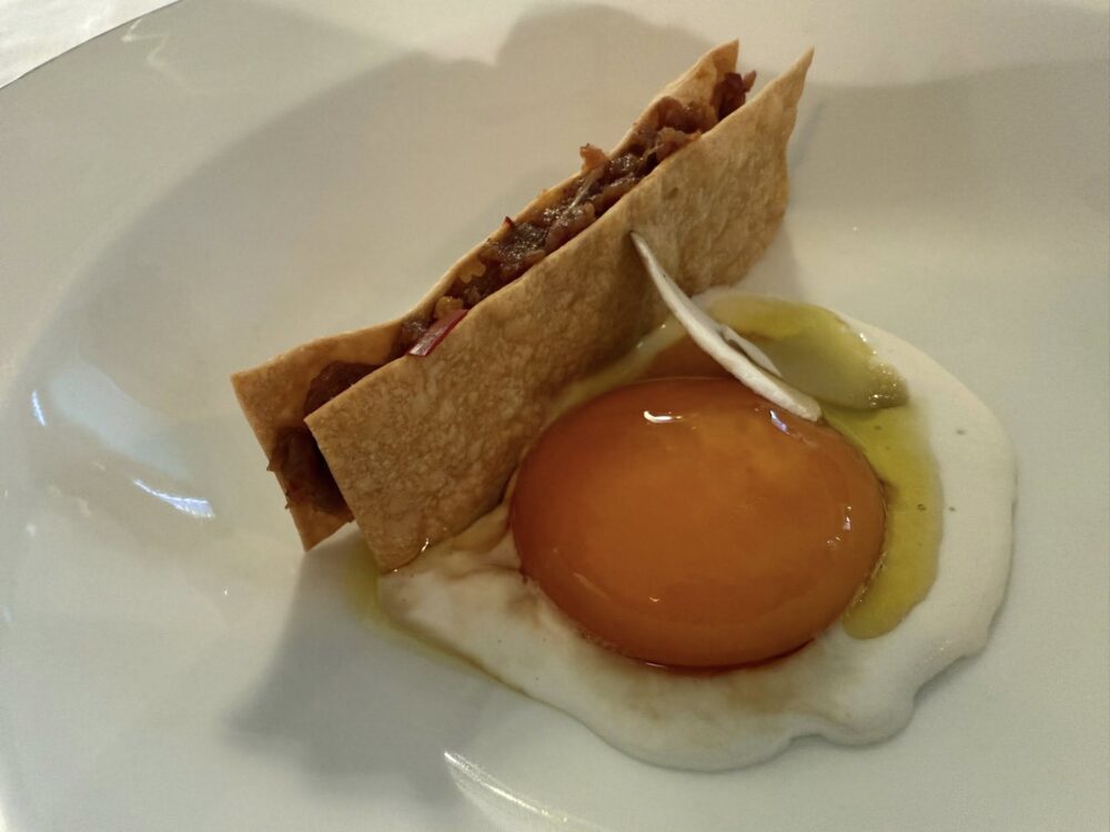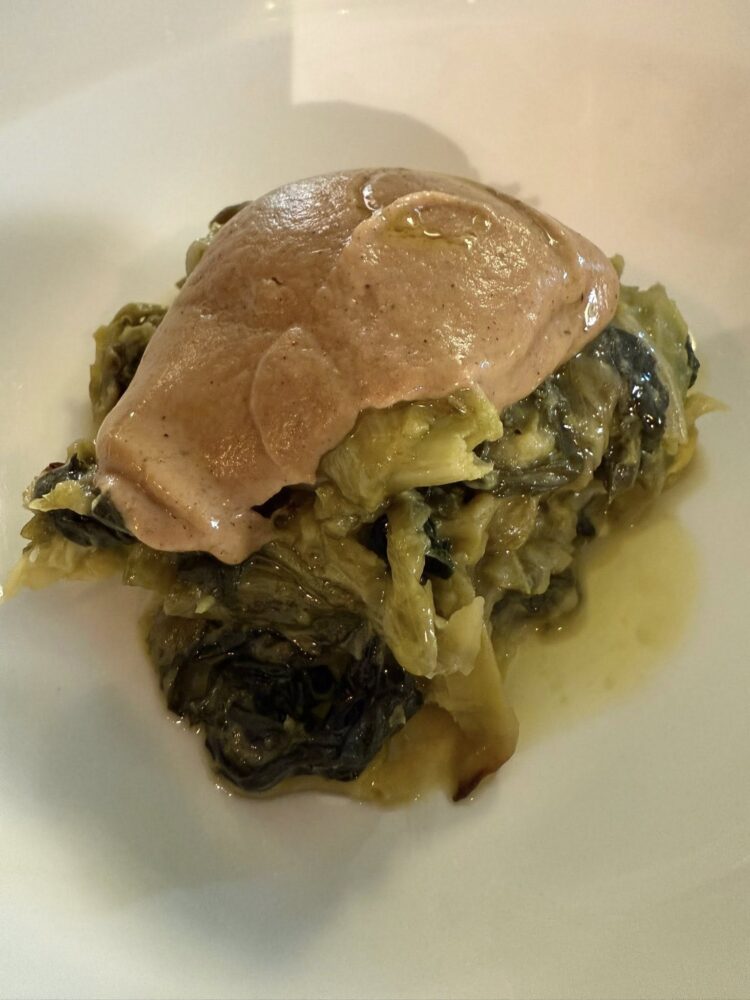 Il servizio del vino è compito del figlio di Tassa (premesso che i rossi ce li siamo portati da casa). Braccia tatuate di musica ,Timoria, Pavarotti, Petrucciani , e un modo di muoversi che sembra già un tempo, un ritmo. È lui a costruire la colonna sonora del pranzo. Si parte con una Passerina di Colle Bianco, fresca e verticale: un attacco pulito, come un primo accordo per aprire le danze, mentre arriva l’uovo marinato con cialda croccante ripiena di battuto di carne. Cremoso, profondo, pane che non basta, voglia che sale. Poi l’insalata di campo con pecorino fresco grattugiato: una pausa musicale, un respiro netto, un passaggio necessario prima del crescendo vegetale che sta per arrivare. La scarola con caramello di cavolfiore riprende il ritmo: dolcezza appena accennata. Sorprendente per gusto e per abbinamento.