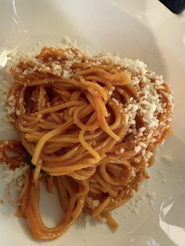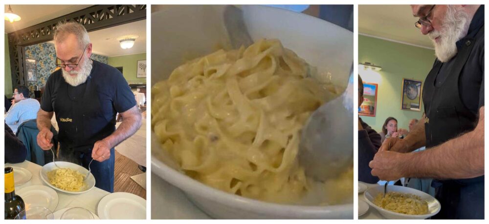 Al tavolo arriva Salvatore, mantecatura finale e servizio del piatto che, secondo lui, dovrebbe esistere in tutte le trattorie: il piatto della mamma. La tagliatella bianca burro e pecorino, essenziale, definitiva.