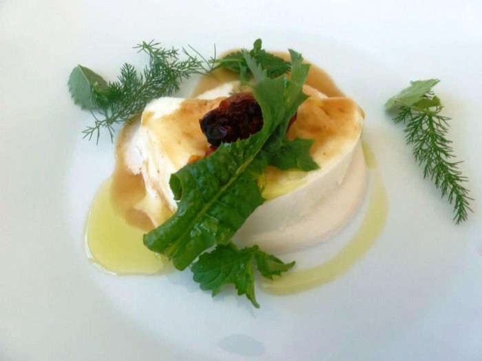 Il cuoco contadino di Acuto infatti, ha presentato una semplice fetta di mozzarella, tagliata ad arte; alla base, una salsa di mandorle pelate con infuso di latte e siero di mozzarella al profumo di buccia di bergamotto: “a me piace giocare con le sfumature dei profumi e la sensorialità dei piatti. Sono invece andato oltre utilizzando il ‘bruciato’, gusto estremo, non sempre piacevole. Ho utilizzato concentrato di pomodoro ‘bruciato’ ottenuto con pomodorini spaccati e marinati in aceto e zucchero di canna per 24 ore e poi infornando ad oltre 200°;una volta avvenuta la ‘bruciatura’, i pomodori si rimettono nella marinatura e si fanno evaporare per 7 – 8 ore; la salsa viene legata con radice secca dei miei boschi per ottenere una consistenza quasi di pomodoro caramellato;il mio obiettivo è fissare la persistenza dei sapori al palato, quasi come un fondo bruno; riesco così ad allertare quel ‘sesto senso’ della memoria che mi riporta alla lasagna domenicale con la crosticina bruciata, la parte più ghiotta. Il piatto si finisce versando il pomodoro bruciato liquido sulla fetta di mozzarella, le bucce di pomodori essiccati per il senso del croccante e le erbe colte nei prati vicino casa, dove nascono le idee”. Si avverte il sapore della terra e la consistenza e la natura della mozzarella non sono state toccate.