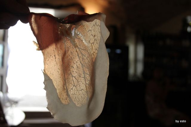 Eccone una fetta in trasparenza con la sua trafilatura di perlaceo grasso intriso di essenze e sapori.