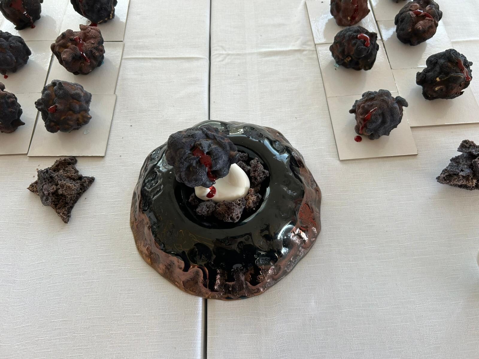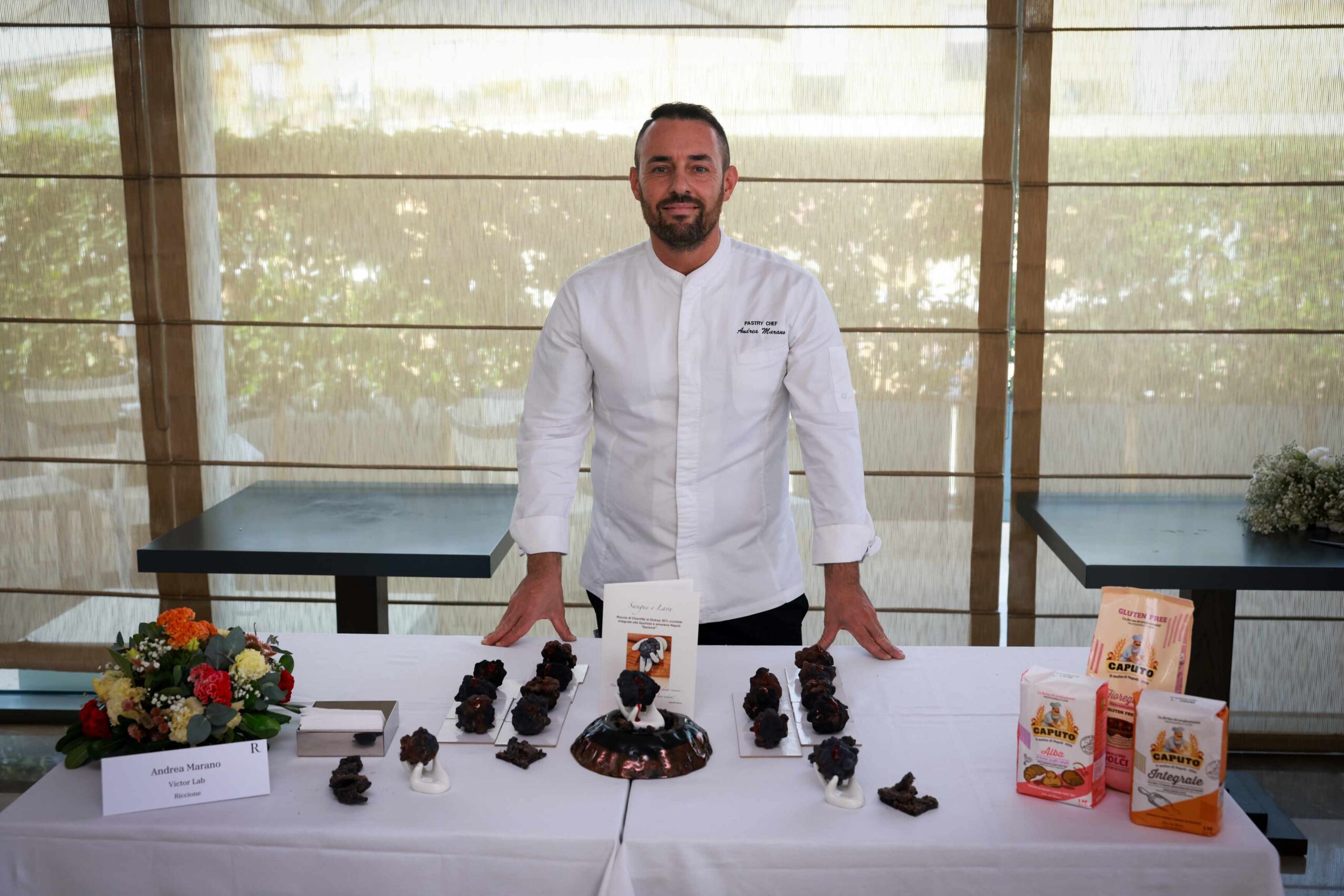 Andrea Marano, del Victor Lab di Riccione, ha presentato alla giuria ‘Sangue e lava’: una roccia di cioccolato al latte modellata a mano, con crumble alla liquirizia, chantilly al Dulcey e inserto all’amarena. Il dolce ha voluto ricordare il miracolo del santo che, nel Seicento, ferma la lava mentre l’inserto all’amarena non solo la liquefazione, ma anche il divenire continuo della città che non è mai uguale a sé stessa.