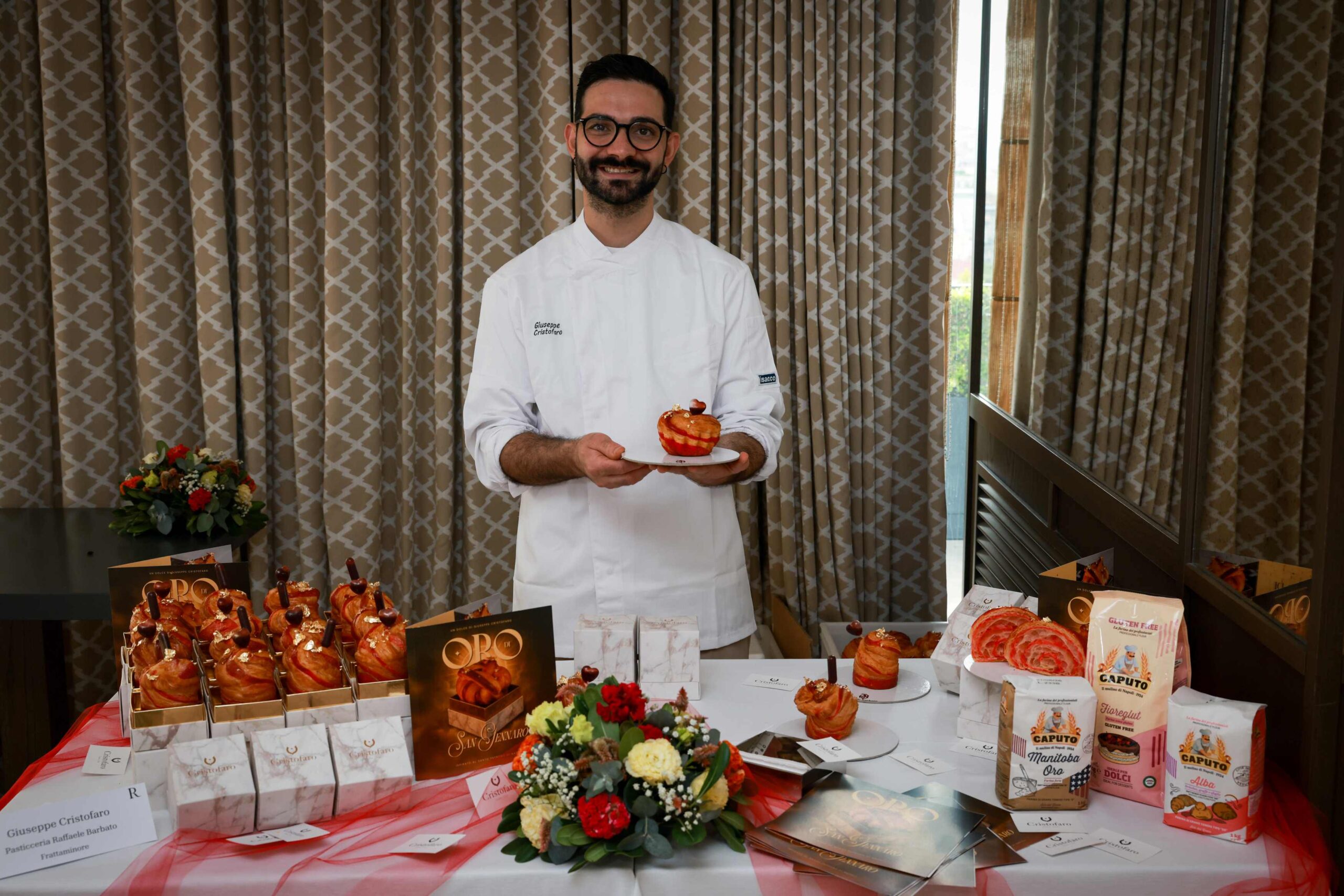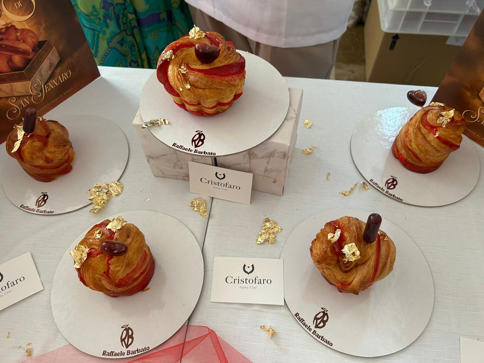 Giuseppe Cristofaro della Pasticceria Raffaele Barbato di Frattaminore, con il suo ‘Oro di San Gennaro’, una pasta brioche con crema di bufala aromatizzata allo zafferano e cremoso alle ciliegie. Un dolce da passeggio che, grazie alla elegante box, si presta anche ad essere un’originale idea regalo.