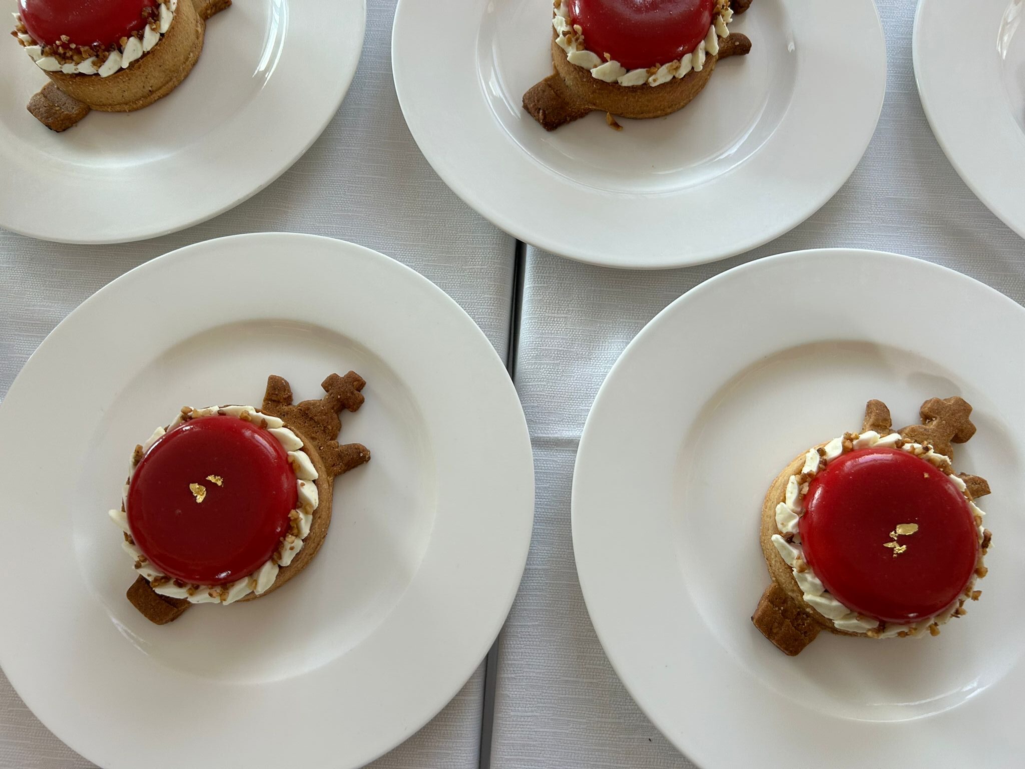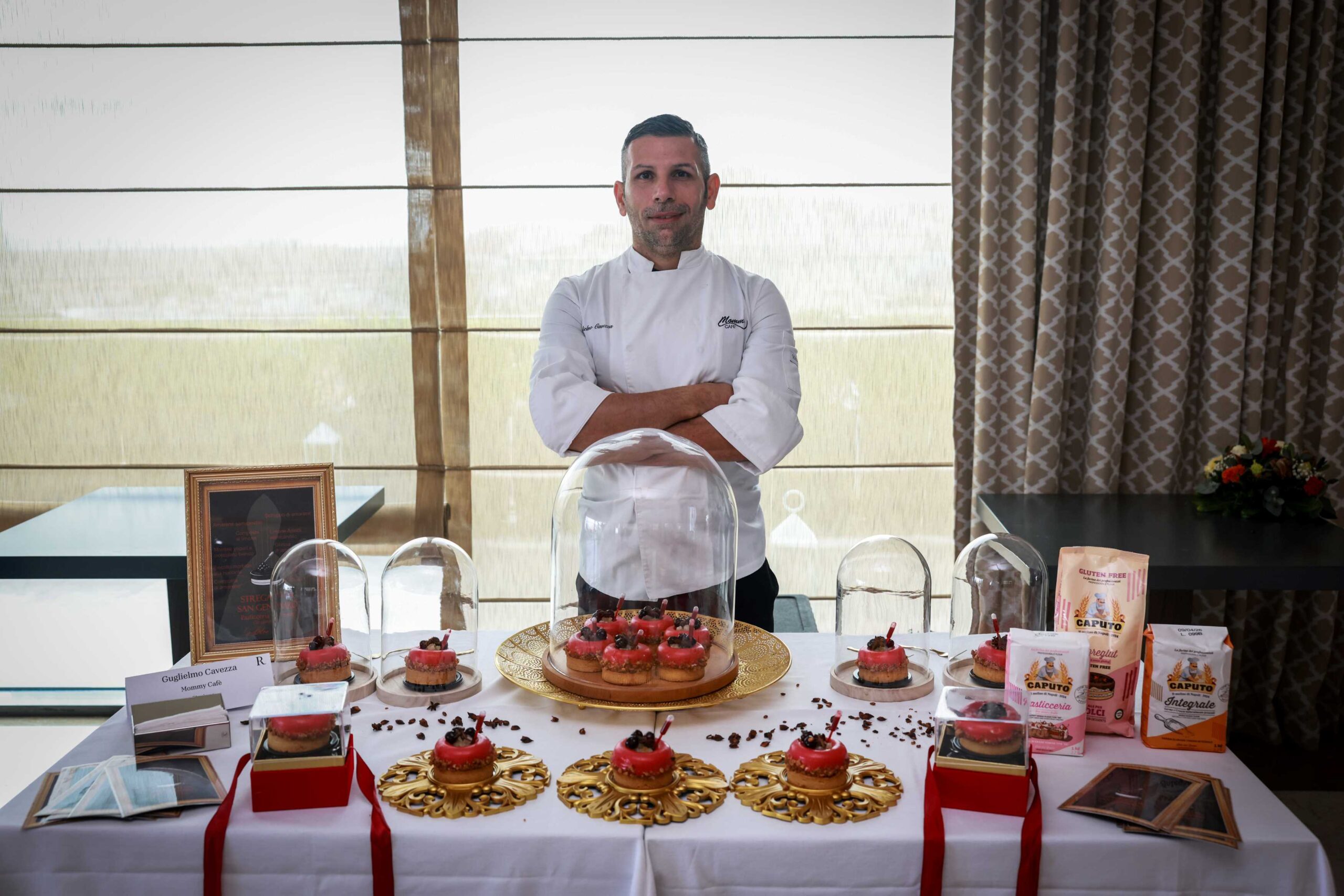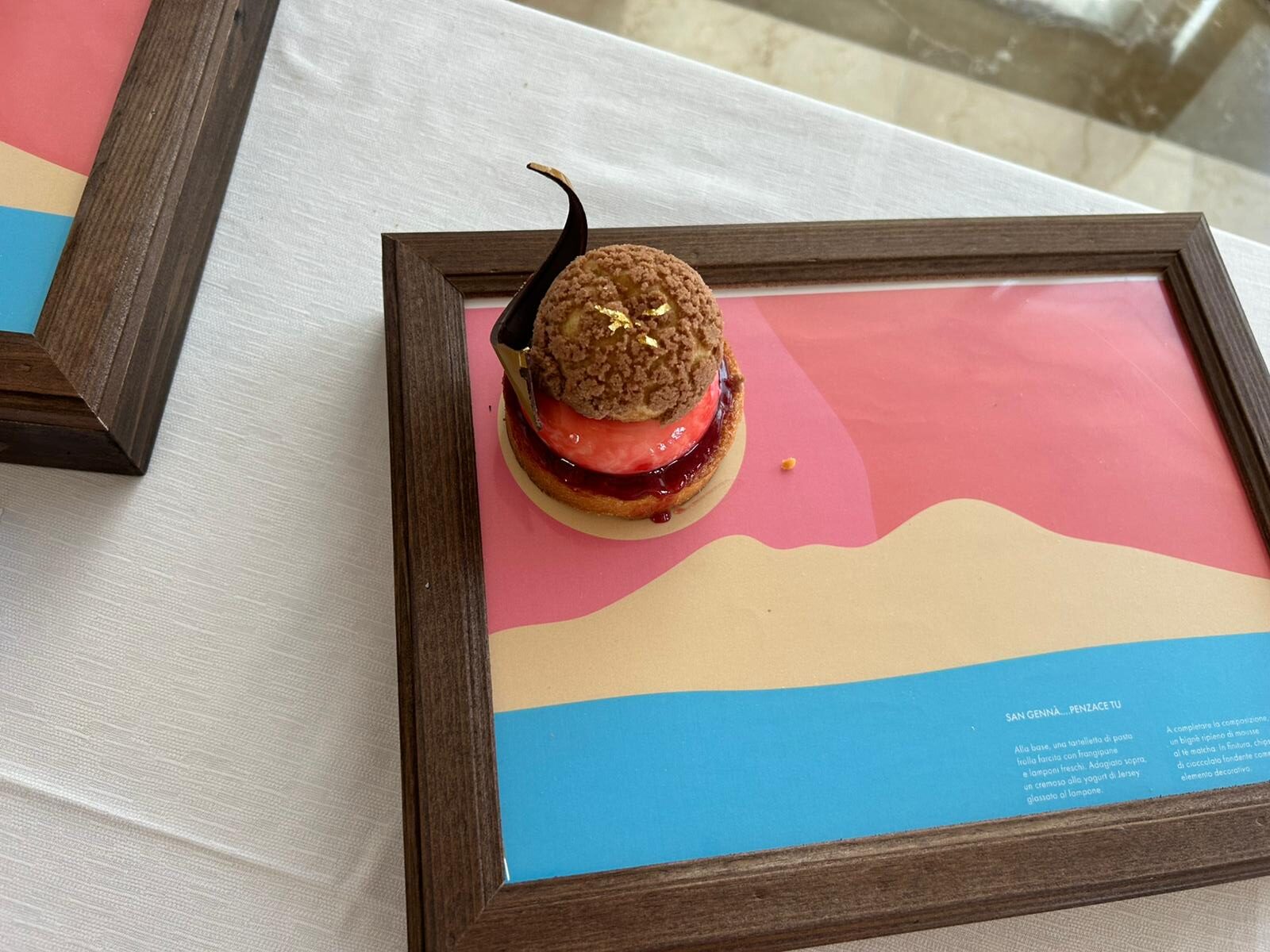 Angelo Guarino, pastry chef de La Corte degli Dei di Palazzo Acampora, ad Agerola, è arrivato in finale con ‘San Gennà… penzace tu‘, una tartelletta di pasta frolla, con lamponi e crema di mandorle, mousse di yogurt glassato al lampone, bignè con cremoso al té matcha e craquelin al cioccolato.