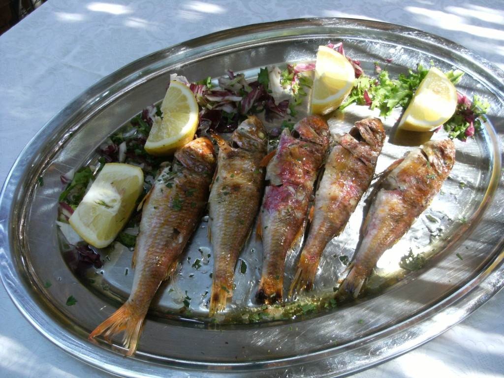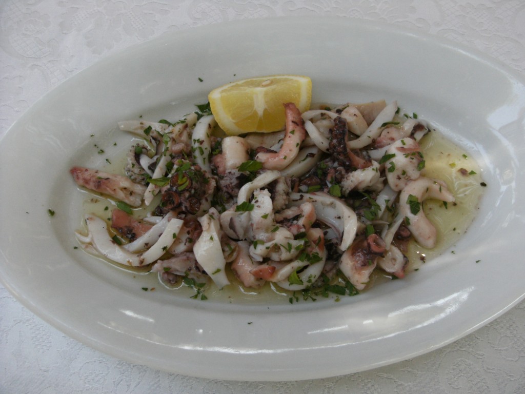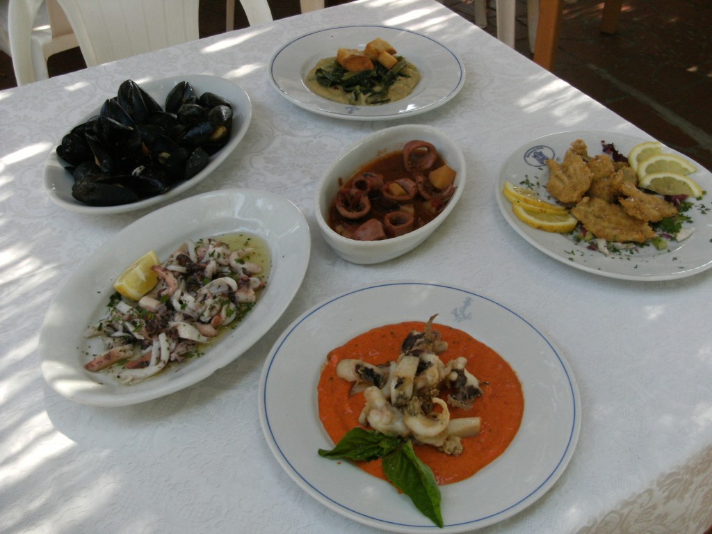 In primis, ecco avanzare impettito un sestetto bene assortito che si propone ai nostri occhi e, subito dopo ovviamente, al nostro già salivante palato: impepata di cozze freschissime; insalata di mare superlativa; alici spinate ed impanate fritte paradisiache; seppie con salsa di peperoni imperdibili; calamaro in umido, con patate da leccarsi i baffi (e per fortuna io ce li ho…!) e purea di fave con cicoria e pane tostato da antologia.