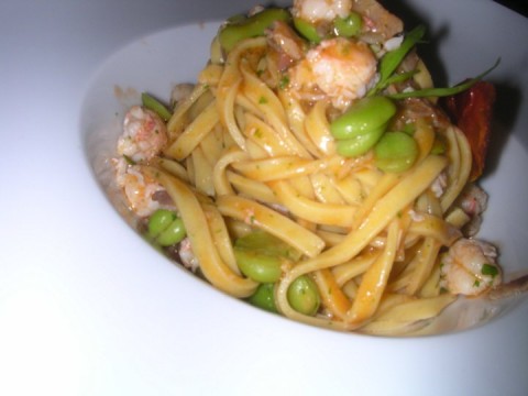 Tra i primi ricordiamo le fettuccine con scampetti di paranza, fave e pancetta di nero