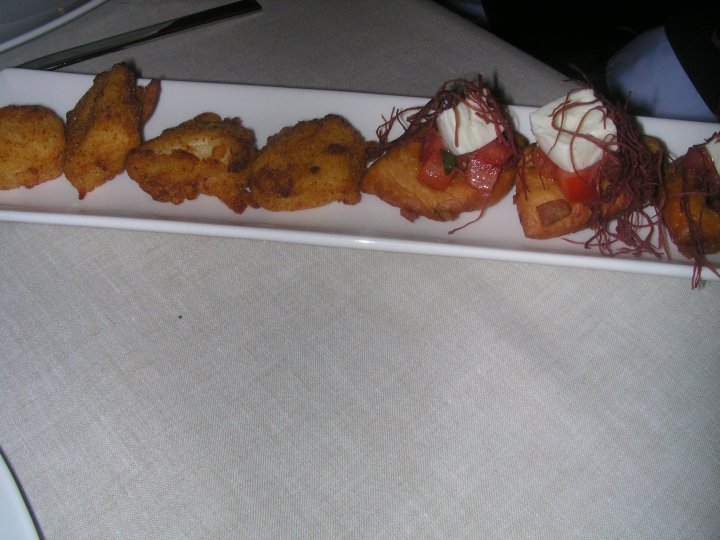 Tra gli altri antipasti: girello di bufalo marinato con tortino caldo di zucchine, millefoglie di filetto di maialino con broccoletti e mozzarella, lupini gialli e mela annrca, terrina di foie gras e brulé, fagiolini, pan brioche tostato e composto di pera.