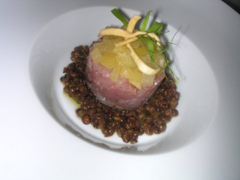 Abbiamo iniziato con una tartare di tonnetto con mela limoncina e lenticchie in umido
