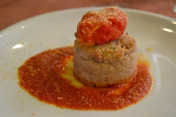 secondo: polpetta di manzo ” dal cilindro”, ripiena di uvetta e pinoli con involtino di papaccella.