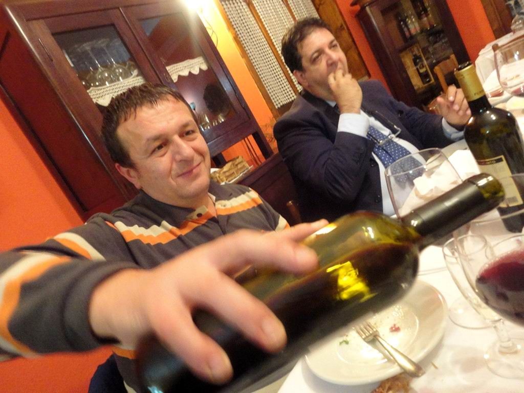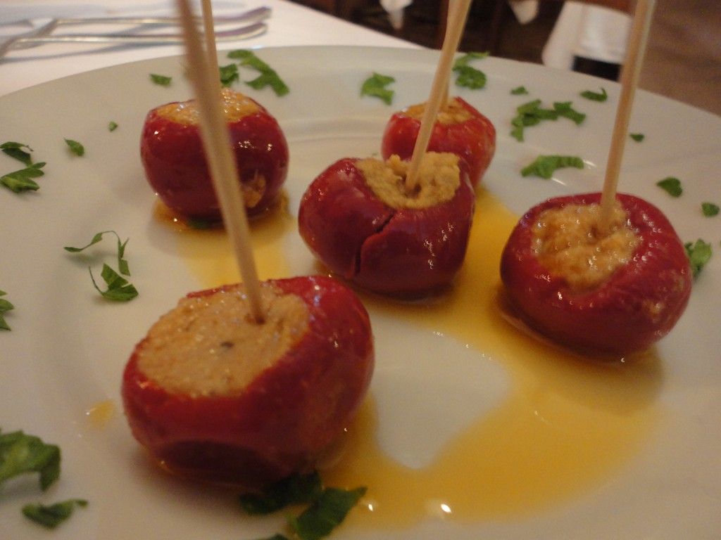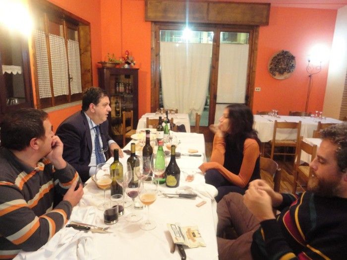 Ci facciamo forza e tiriamo giù la saracinesca della macelleria prima di svuotargliela, e insieme a Mario facciamo duecento metri e siamo a via Roma nel ristorante. Manco il tempo di conoscere Amelio e la sua splendida famiglia, che il Pigna mi è già con il fiato sul collo a dileggiarmi garbatamente su quello che sarà il refrain della serata: l’Irpinia avrà come capoluogo di provincia… Benevento!!! Ancora non è detta l’ultima parola!!!. Si inizia dal benvenuto di peperoncini ripieni e crostini di pane dorati nel forno a legna per le pizze, aromatizzati con olio di produzione propria, alle erbe.