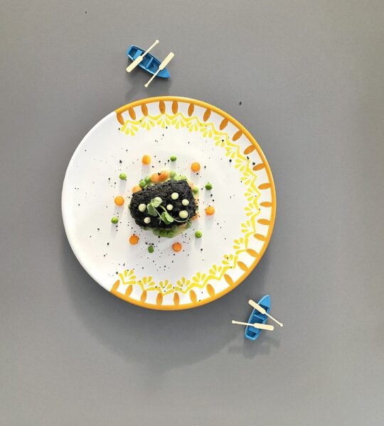 Disporre con un coppa pasta l’insalata russa al centro del piatto di ceramica, avendo cura di non schiacciarla troppo; intorno a questa, disporre alternativamente 6 piselli novelli e 6 palline di carote, al fine di ricreare l’immagine delle “caramelline” di San Nicola. Disporre il baccalà correttamente tamponato sull’insalata russa, ultimando la decorazione del piatto con 8 spuntoni di maionese di patata in superficie e con l’apposizione di un germoglio di pisello. Spolverare leggermente con del panko al nero di seppia per ricreare l’effetto della cenere.