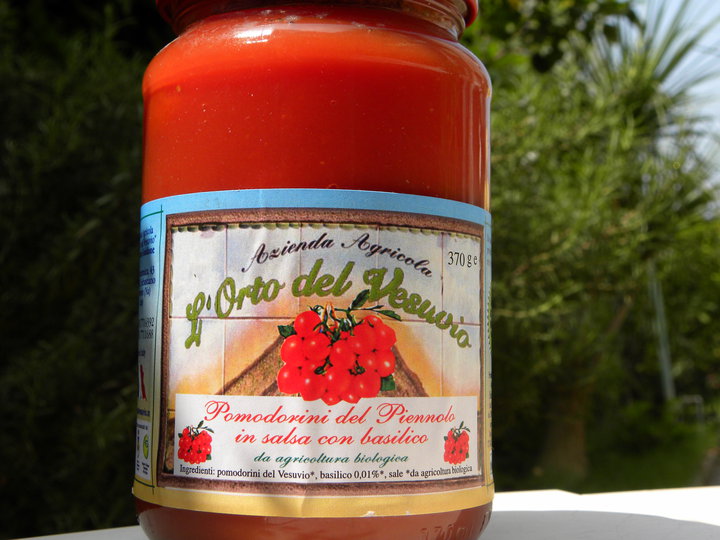 Pomodoro del Piennolo in salsa con basilico. Ingredienti: pomodorini del Vesuvio, basilico, sale. Punto . Tutto è di agricoltura biologica, certificato da Bioagricert , coltivato sul Vesuvio.