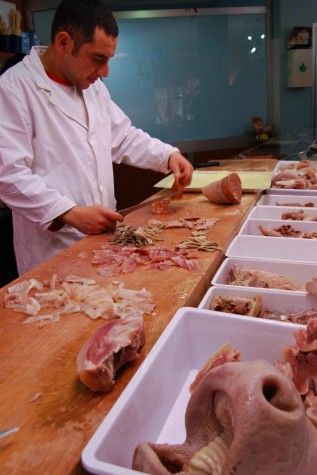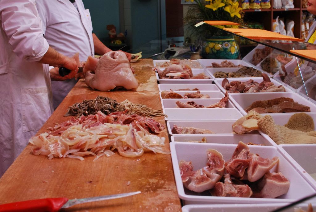 Francesco prepara piede e muso del maiale, muso del vitello, mammella della vitella da latte, i quattro stomaci del vitello (rumine, reticolo, maso e abomaso), l’intestino del vitello ed in più, prepara una specialità della sua famiglia, un insaccato molto piccante composto da cotenna e pezzi cartilaginei del maiale.