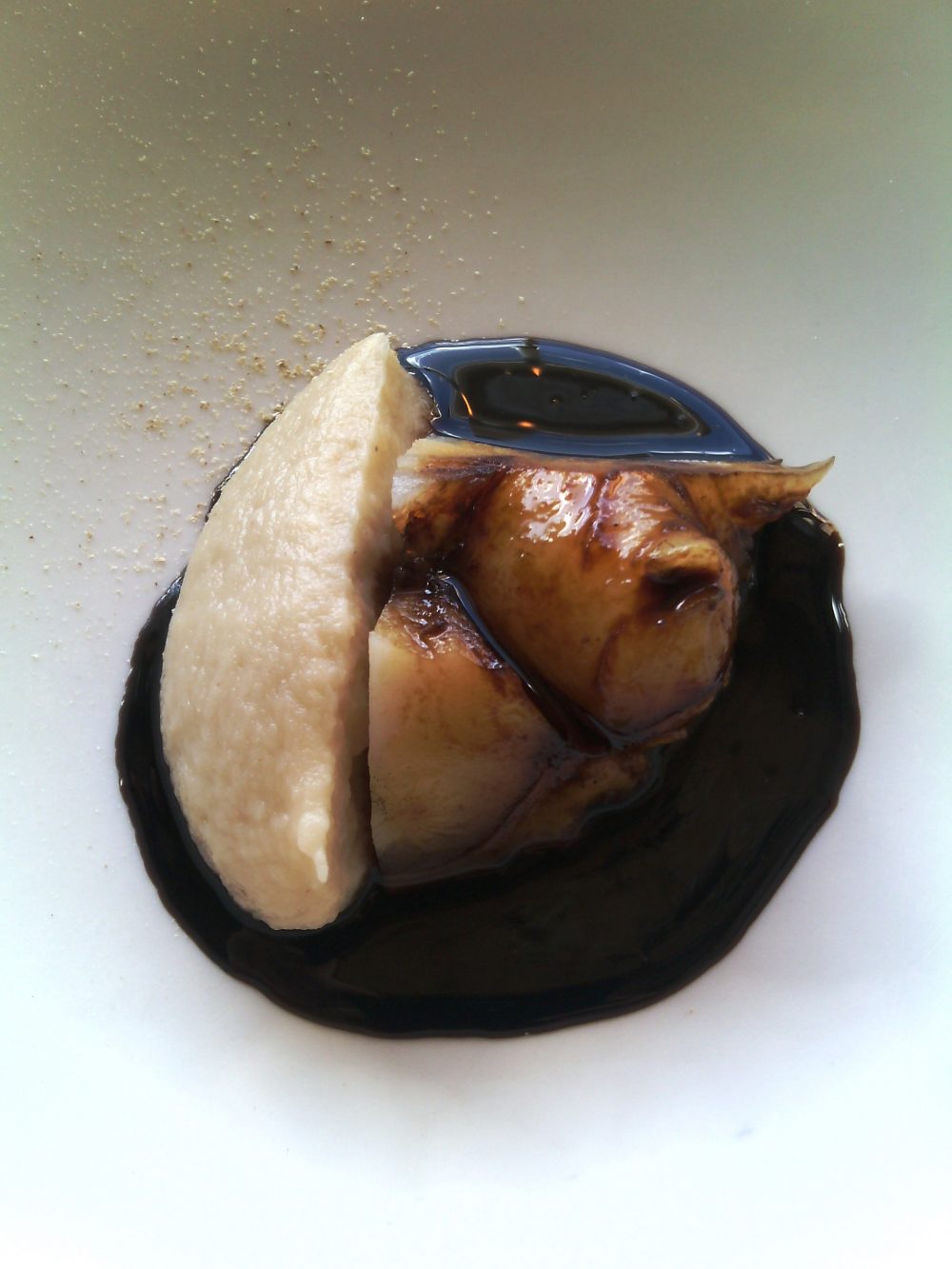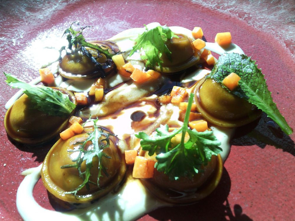 Il colpo da maestro lo si vede nella pasta fresca, spessa e con un buon morso, complice l’importante presenza dei tuorli d’uovo. I bottoni d’anatra sono serviti su due golose salse, una al burro acido e l’altra, più strutturata, al pan brioche per conferire dolcezza e smorzare il ferroso dell’anatra nel ripieno.