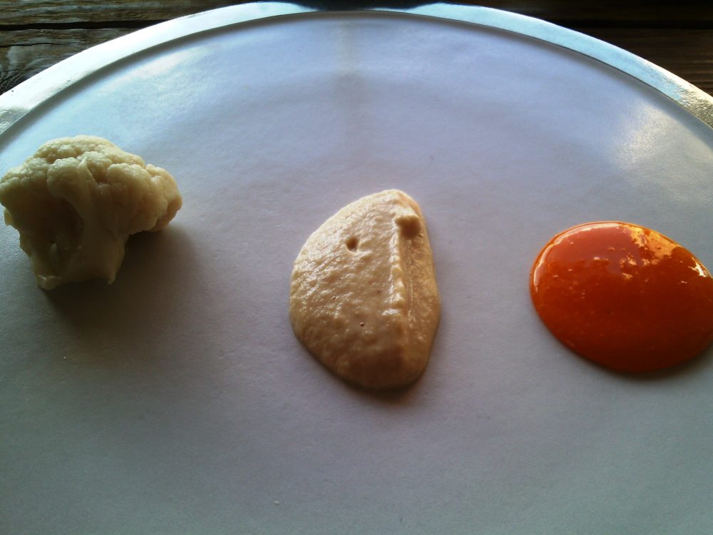 Sanbrite, Cavolfiore – cavolfiore marinato, elisir di foglie di cavolo, purea di cavolfiore arrostita, crema di tuorli
