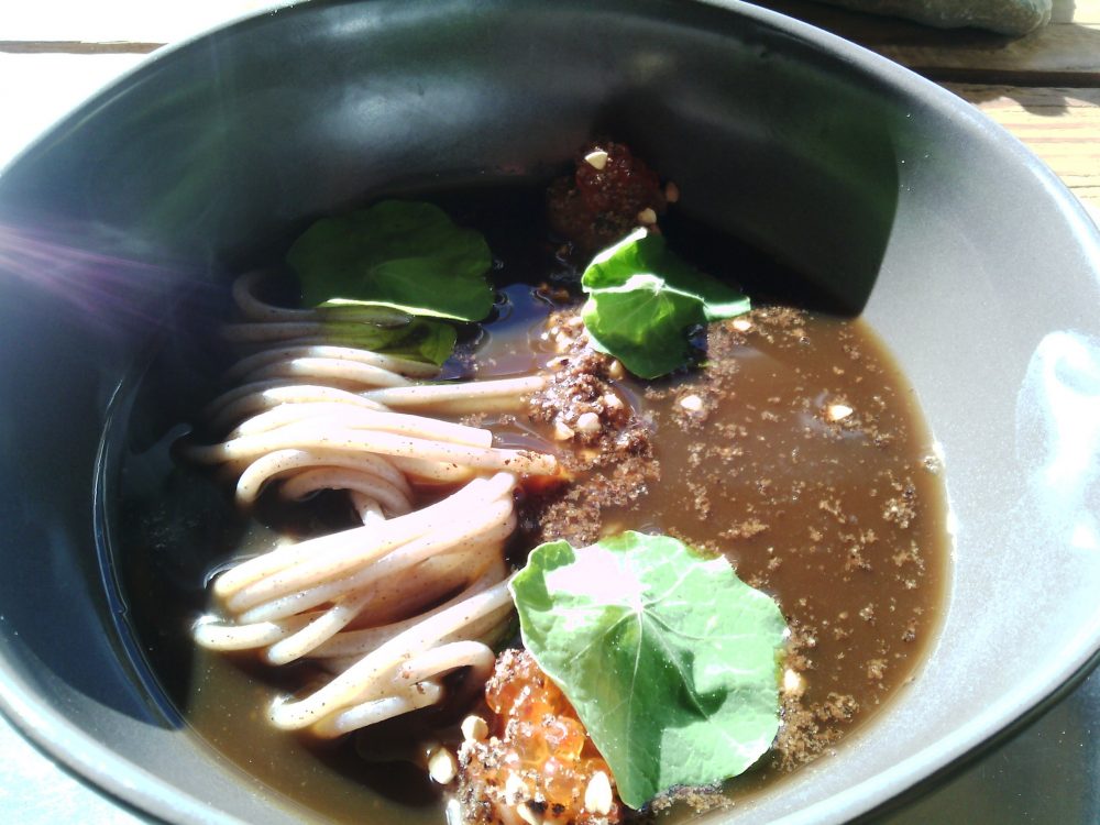 Sanbrite, Soba di montagna – spaghettini di grano saraceno, crumble di porcini, grano saraceno, crema di porcini, brodo di funghi, trota e sue uova