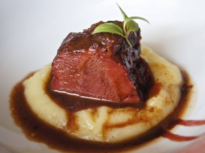 Una succulenta e morbida guancia di manzo con soffice di patate del Taburno e riduzione all’aglianico.