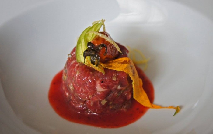 Ancora crudo, tartare di Angus italiano alta qualità con salsa di fragole e datterino confit, buono ed equilibrato.