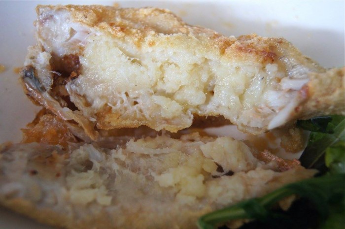 Lampara di mare con salsa agrodolce, dove la triglia è farcita con baccalà mantecato con olio profumato all’aglio e timo.