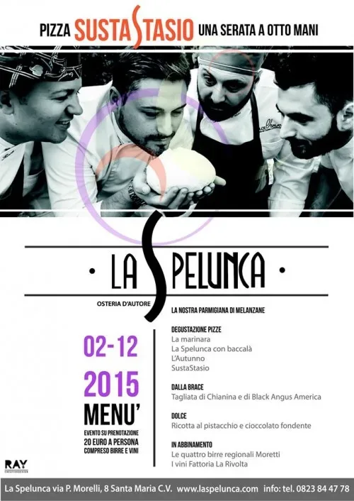A La Spelunca pizza SustaStasio 19/11/2015 Torna a: Santa Maria Capua Vetere, 2 dicembre. A La Spelunca pizza SustaStasio: otto mani in pasta con i fratelli Susta A La Spelunca pizza SustaStasioSuccessiva →