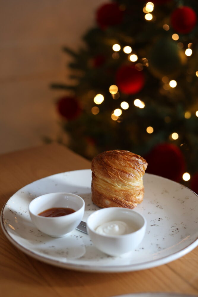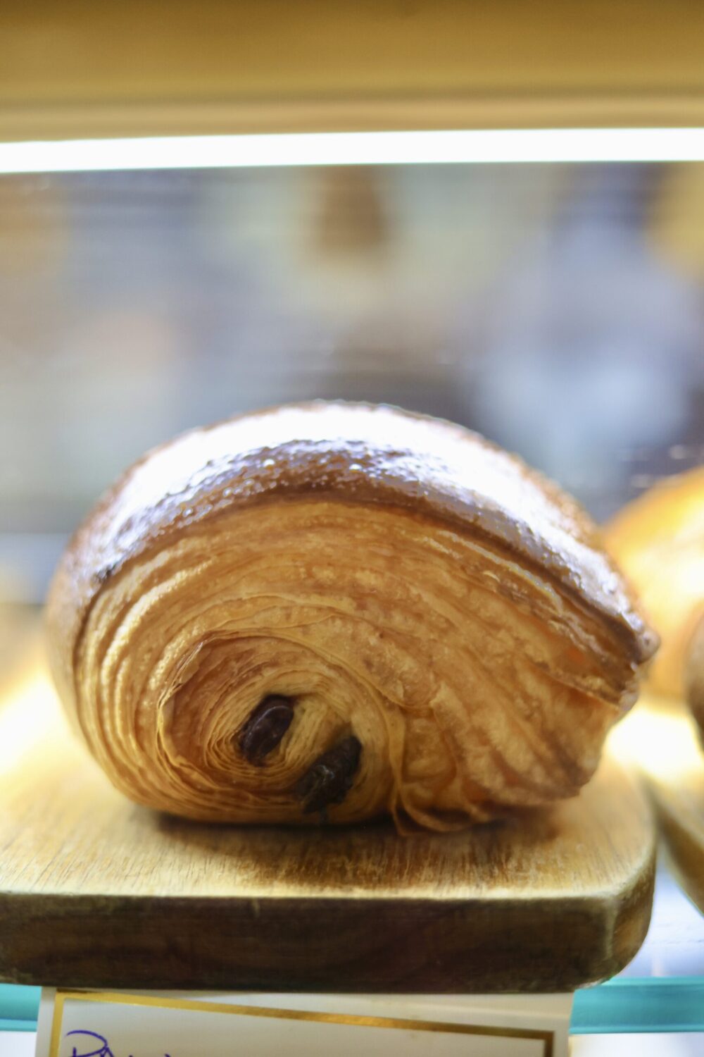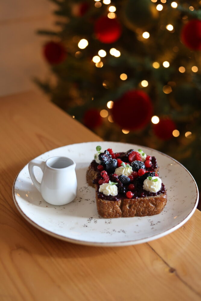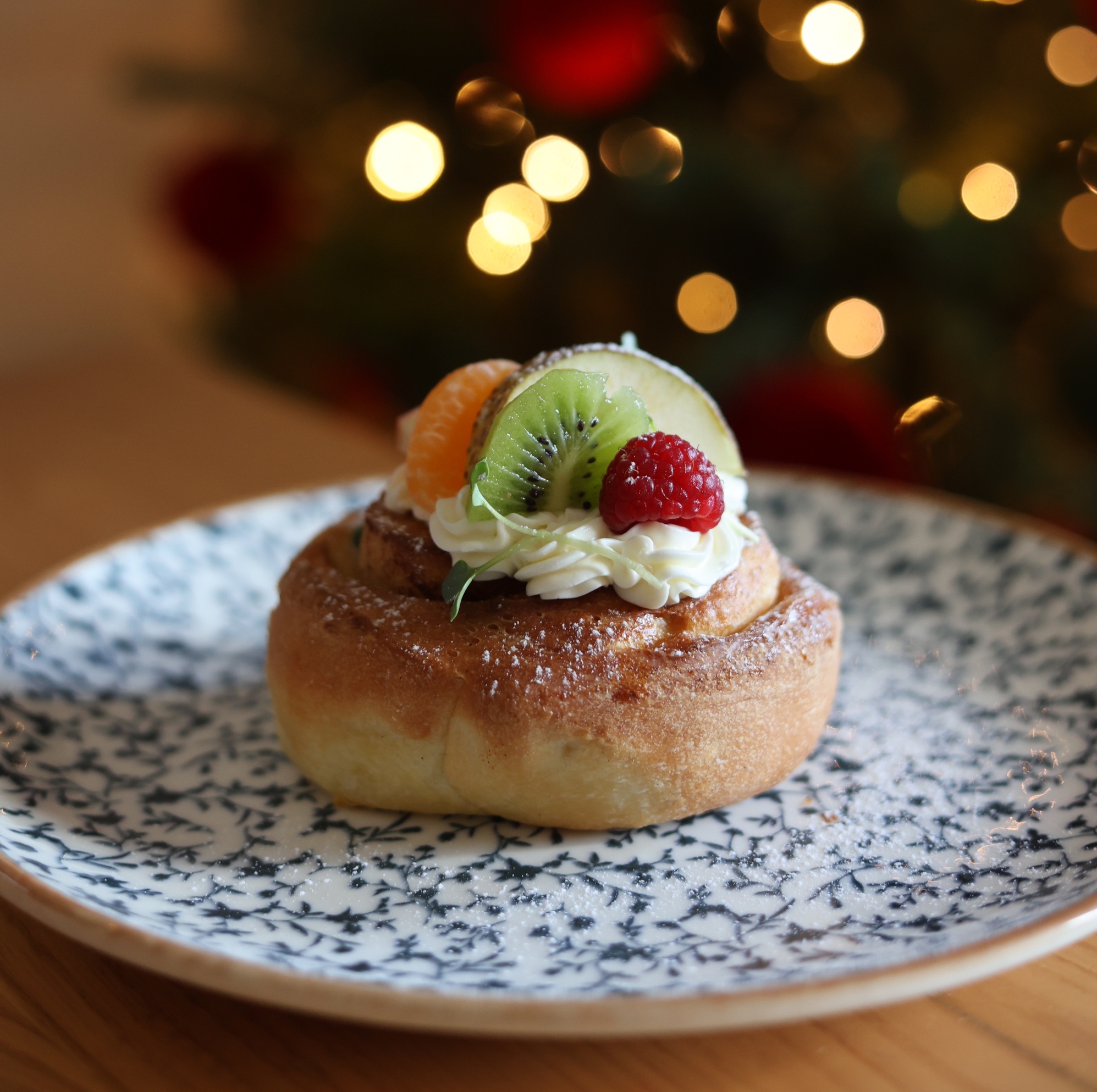 Abbiamo poi assaggiato il cinnamon roll, simbolo del Natale, profumato alla cannella e servito con frutta fresca e crema al mascarpone. Abbiamo accompagnato tutto con un chai latte e un cappuccino preparato con latte di avena. Una menzione speciale va alle sbriciolate, vero vanto del bistrò: quella che abbiamo provato, al grano saraceno e frutti di bosco, era quasi senza zucchero e senza lattosio, ma esistono molte varianti, tra cui quella al cioccolato. Al banco, ogni mattina, si trovano anche pain au chocolat, cornetti classici e dolci per ogni esigenza alimentare.