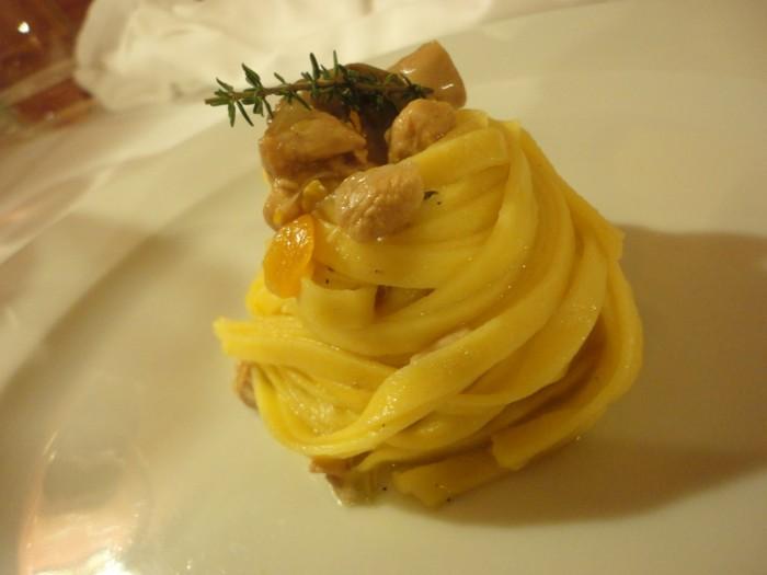 Ed è la volta dei primi: si inizia da una fettuccina di Aldo(artigiano di Macerata) condita con un sughetto a base di carne di coniglio santangiolese e porcini di Bagnoli Irpino. Buono anche questo, ma come formato di pasta c’avrei visto meglio una sacrosanta maccaronara, e forse questo è un piatto troppo delicato da abbinare a quei vini materici e muscolosi, ma…questo è compito del Pigna!!!