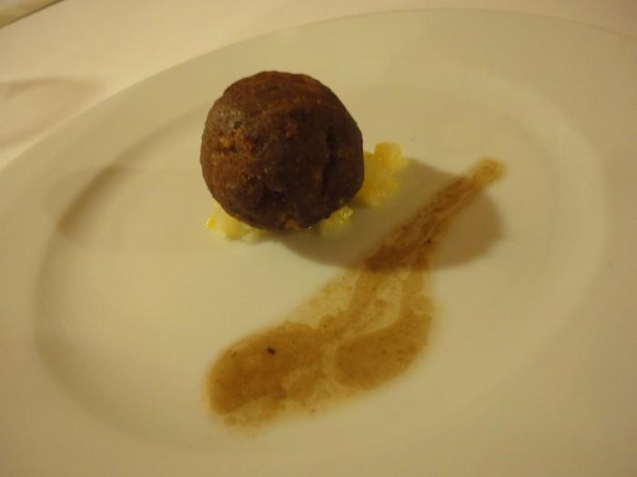 Si inizia con il benvenuto consistente in una polpetta di coda di vitello con limone candito.
