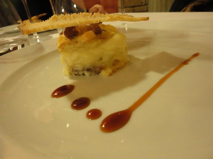 I “rocchi” di coda vengono cotti sotto vuoto per 12 ore a bassa temperatura e con la carne ottenuta dal disosso, con l’aggiunta di pane e uovo, viene realizzata la polpetta. Oltre che essere oggettivamente centrato come sensazioni organolettiche, di questo piatto ci è piaciuta molto anche l’idea della contrapposizione con il limone candito, che a chiudere gli occhi, dava la sensazione del gelato al limone d’antan che tutti noi da bambini abbiamo sicuramente degustato. Siamo passati velocemente, grazie al servizio cortese ed estremamente professionale, all’entree con “Millefoglie di Finocchio e caciocavallo”. Piatto con prodotti di forte identità territoriale, qui siamo al centro del triangolo…del caciocavallo podolico, Montella- Calitri -Vallata, ma trasformati con idee fortemente innovative.