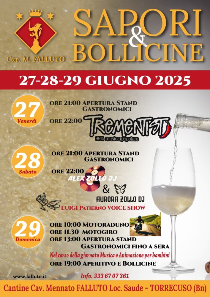 SAPORI & BOLLICINE – dal 27 al 29 giugno presso le Cantine del Cav. Mennato Falluto a Torrecuso sul Taburno