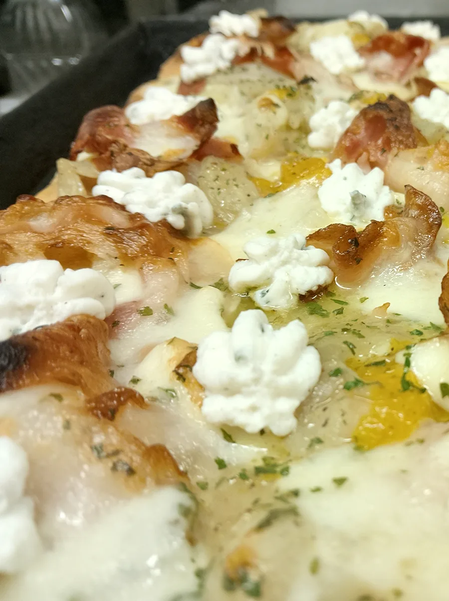 Condire la base con il fiordilatte, la zucca precedentemente e i finocchi. Aggiungere il provolone e terminare la cottura. Guarnire con dei ciuffetti di ricotta, precedentemente condita con pepe, salvia e prezzemolo e terminare il tutto con un filo d’olio.