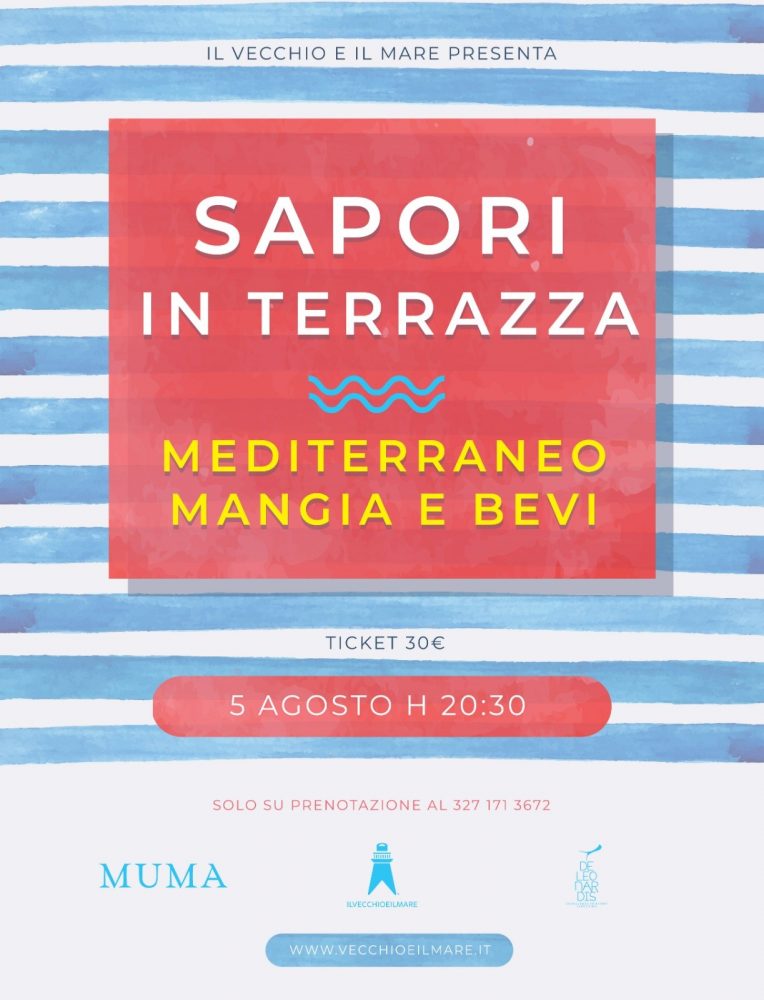 Sapori in terrazza è la rassegna enogastronomica che sta riscuotendo sempre più successo, organizzata a Trani dalla consulente enogastronomica Francesca de Leonardis e dai ragazzi de “Il vecchio e il mare”. Il prossimo incontro avrà luogo Mercoledì 5 agosto, alle ore 20.30 a Trani, presso il Vecchio e il Mare, nell’oramai familiare incantevole ambientazione tutta racchiusa tra scogli e mare e sarà dedicata allo “ Spirito Mediterraneo “, tutto incentrato su quelle che sono le vere componenti dell’anima mediterranea, un percorso inedito che coinvolgerà gli ospiti in un itinerario dedicato ai profumi ed ai sapori del nostro Mare, ma con i cinque sensi rivolti anche alla recente geniale innovazione costituita da MuMa , il primo Gin made in Puglia.