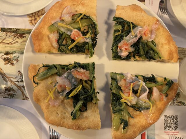 La pizza fritta e ripassata (in forno) mostra la mano ferma e attenta agli equilibri dello chef De Simone. Condita con gamberi, lardo, limone salato e borragine.