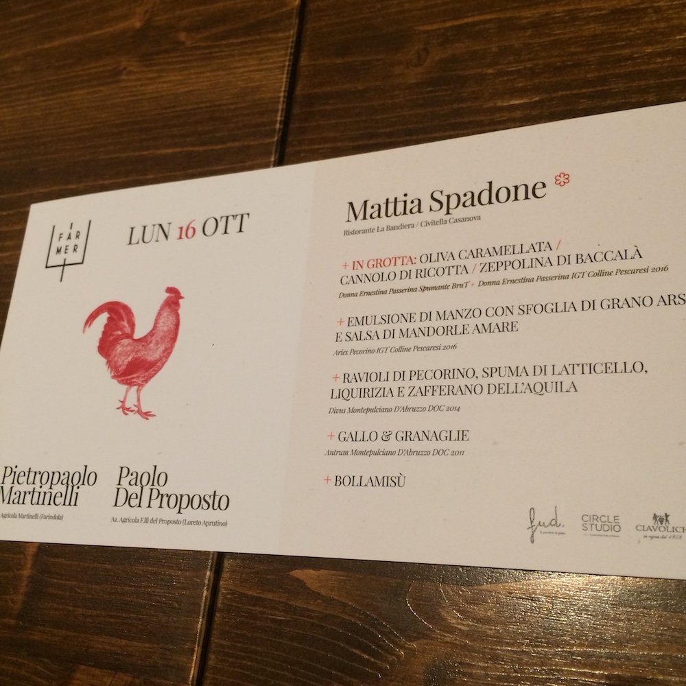 A unire in “motrimonio” due belle realtà come l’azienda agricola De Preposto di Loreto Aprutino e quella di Pietropaolo Martinelli a Farindola è stato Mattia Spadone giovanissimo chef del ristorante stellato di Civitella Casanova (Pe) ha interpretato il Galletto di De Preposto e la ricotta, nonché il pecorino di Farindola di Martinelli.