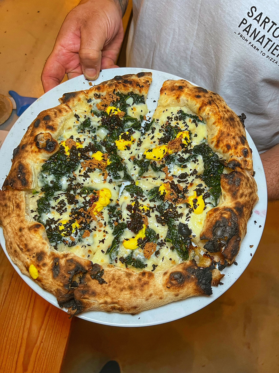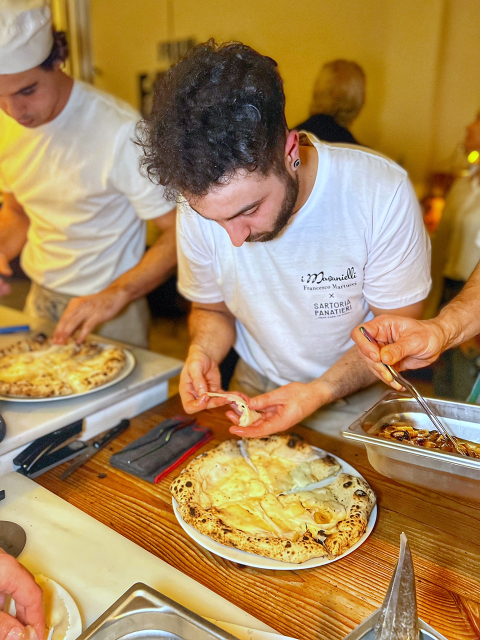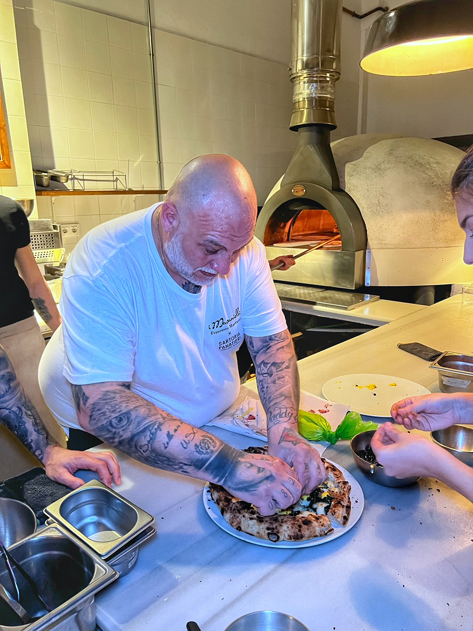 Rafa Panatieri e Jorge Sastre – fondatori di Sartoria Panatieri a Barcellona – dopo un evento a Napoli fanno sosta dal numero 1 al mondo in forza per 50 Top Pizza 2022, per provare le sue pizze. Essendo anche loro professionisti notoriamente famosi per la totale attenzione alla materia prima – utilizzano solo prodotti spagnoli e molti auto prodotti – decidono di invitare Francesco a casa propria organizzando un evento diventato poi sold out in brevissimo tempo. Una combinazione vincente che mette insieme due realtà molto diverse ma entrambe orientate all’approccio gastronomico sulla pizza. Entrando si respira fermento, come quello che la Spagna sta attraversando in questo periodo a livello gastronomico, in una location semplice ed elegante.
