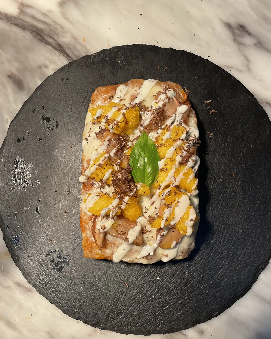 Condire con fiordilatte, polenta fritta, funghi porcini e fonduta di Gorgonzola DOP e tartufo.