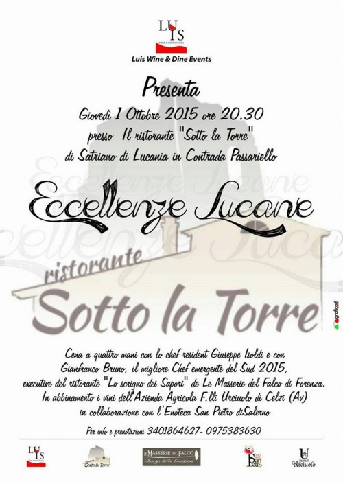 Giovedì 1 ottobre 2015 alle ore 20:30 al ristorante “Sotto la Torre” di Satriano di Lucania (Contrada Passariello) si terrà una cena a quattro mani con lo chef resident Giuseppe Isoldi e Gianfranco Bruno, il migliore Chef emergente del Sud 2015, executive del ristorante “Lo scrigno dei Sapori” de Le Masserie del Falco di Forenza.