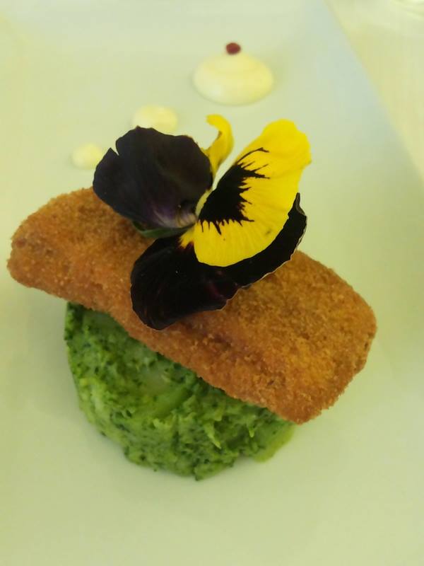 In antipasto la cotoletta di lampuga su schiacciatina di broccoletti e maionese di arancia: un modo divertente e vivace di proporre un pesce povero e di esaltare i sapori con la determinazione dei broccoletti ,la spinta acida della maionese e l’aroma della buccia di arancia.