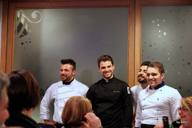 Il dessert, interessante e moderno per l’accennata non compiuta dolcezza della crema, per la raffinata croccantezza della sfoglia e la freschezza della frutta, è stato il Cannolo ripieno di mousse al cioccolato bianco e pepe di Sechuan su crema inglese al mandarino, insalatina di lamponi e lime.